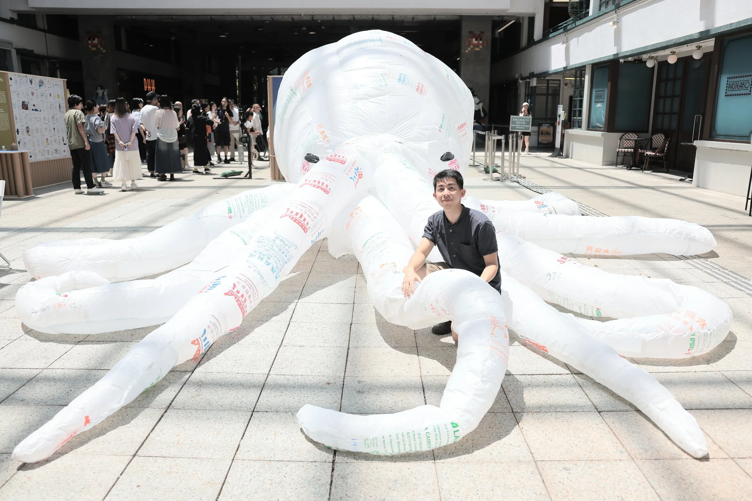 這件作品是一隻超過七米長的巨型八爪魚,由二百多個從洗衣店回收的膠袋製作而成。這種洗衣店膠袋的容量大、材質堅固,大部分卻只用一次,實在太浪費!我們的製作團隊走訪了港九各區收集膠袋,用熨斗接駁造型,加風扇一吹,就立即變身成為一隻栩栩如生的八爪魚了!